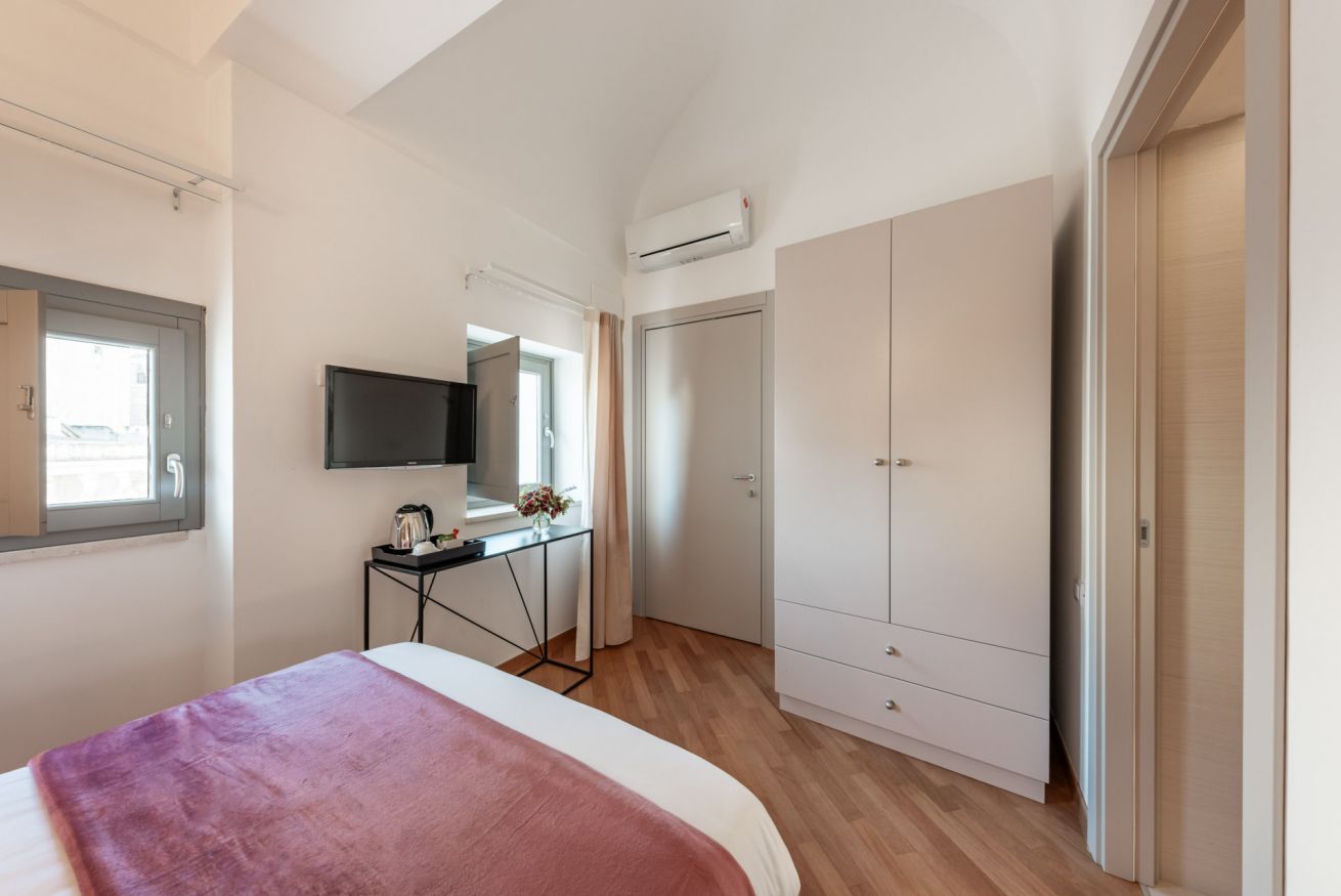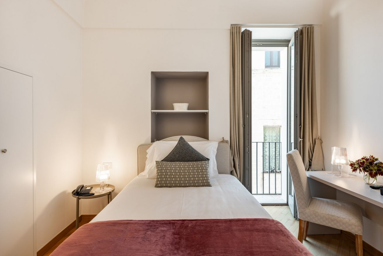 La stanza singola è una stanza funzionale per coloro che vogliono godere della comodità della posizione di Palazzo Indelli. Dotate di doccia, wi-fi, Tv, frigo-bar, set biancheria, set cortesia , phon, armadio, cassaforte.